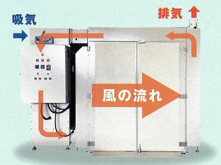 - 乾燥熱風は乾燥室左側面全体のパンチングパネルから上下左右均等に吹き出し、右側面全体のパンチングパネルに吸引されます。