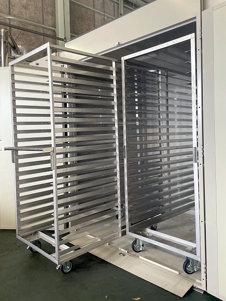 - 乾燥室にはコンパクトなステンレス台車(棚数20段)が2台収容されます。仕込みの完了した台車から随時収納できます。